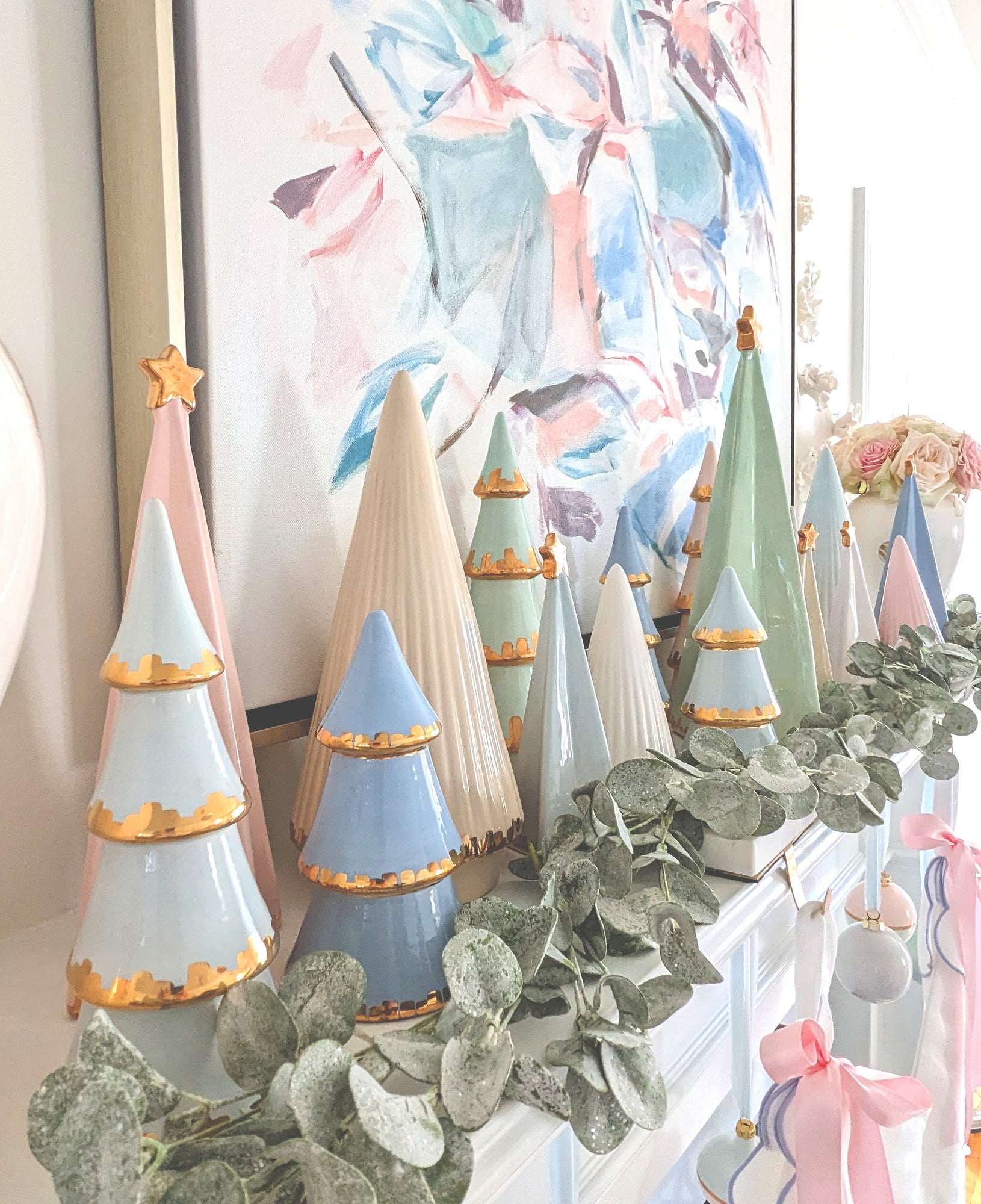 The gorgeous colors and handcrafted charm of these trees make an artful and unique addition to your home for the holidays. Mix and match them to create a personalized and stunning vignette on your holiday table or mantle or sprinkle them about for merry and bright touches throughout your home. Each tree is glazed by hand and adorned with a freehand 22K gold brushstroke trim.