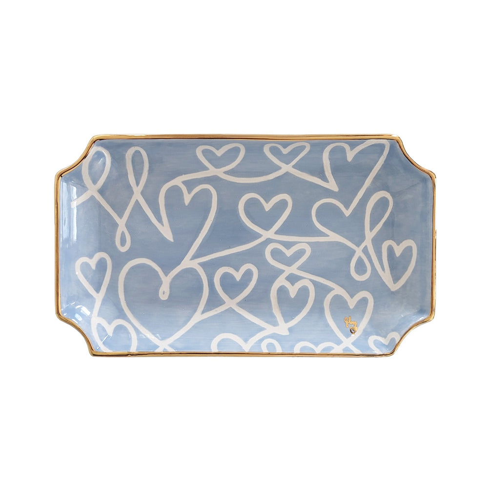Our classic trays are hand-painted by a Ruby Clay artist before being fired for a beautiful and durable finish which is food and water safe. This style features a hand-painted 22K gold trim.