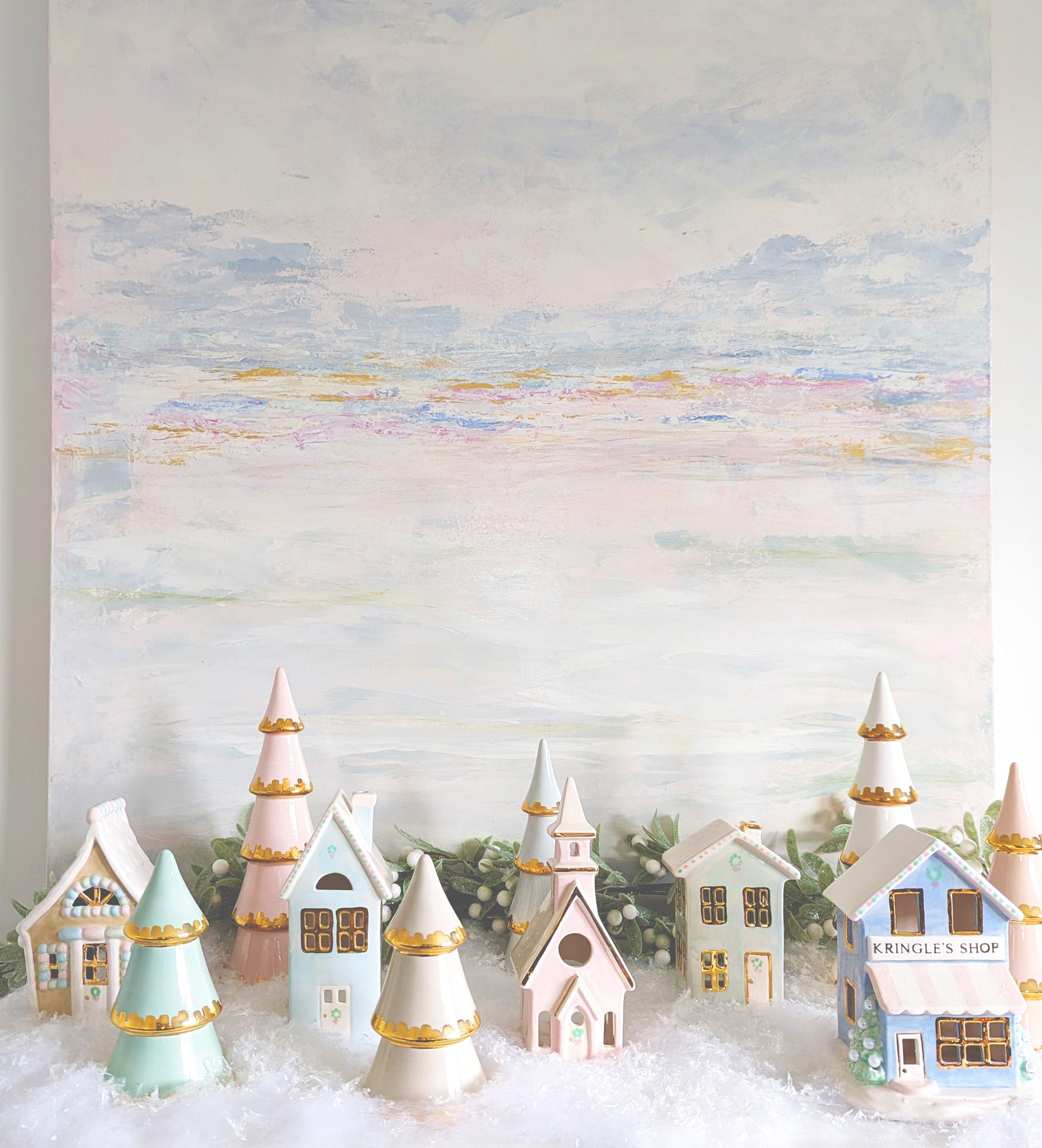 This beautiful hand-painted holiday shop makes a perfect addition to our Lo Home Pastel Christmas Village! The Kringle Shop is an heirloom piece hand painted with charming details and 22K gold accents. Each shop holds a tea light or fairy lights inside which allows warm twinkly light to shine out through the windows to create a dreamy winter wonderland.